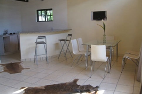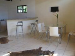 This self-catering cottage has a kitchenette with a microwave, stove, fridge, TV and a modern dining glass table & chairs. There are 2 beds which together make a queen size bed and a double sleeper for children. The en-suite has a shower, there are braai facilities and a secluded veranda with a view of the dam.
